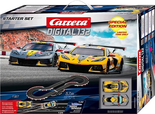 2X Chevrolet Corvette C8.R Gul och silvergrå.Motorväg på 5,7 m med växlingsspår, trottoarkanter och skyddsräcken.2X handkontroller med hastighetsjustering och vippknappStrömförsörjning och anslutningstillbehörSpecifikationer