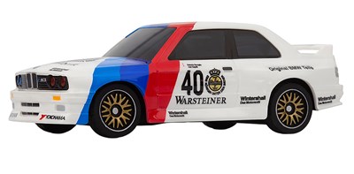 1:10 onroad-plattform från HPI, levererad här med den ikoniska BMW E30 M3-karossen i de välkända M-färgerna och med Warsteiner-logotypen. Bilen kommer nu med axeldrift istället för remmar. Drivlinan är helt inkapslad så att de inte längre utsätts fö