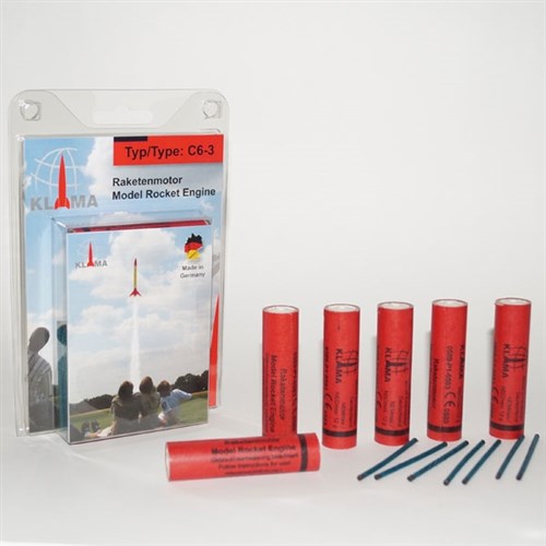 Ett paket med sex raketmotorer och sex pinnar för antändning. Motorerna kan också antändas med elektroniska tänder. Motorerna är konstruerade för användning i modellraketer.