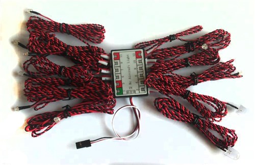 Stort belysningssystem för modellflygplan med 14 lysdioder. 9 vanliga 2 stora 3 små. De två stora och en regelbunden klar LED-blixt dubbel blixt. Dessutom finns det två röda långsamma enskilda blinkningar. Två vita lampor tänds kontinuerligt. Dessutom har du fem vitklara, 1 röd och 1 grön som kan slås på och av via radion.