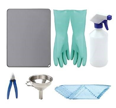 Rengöringsset för hartstryck. Den levereras med 1 silikondyna för substrat, tratt med filter, skrapa, silikonhandskar, sprayflaska och 5 våtservetter.