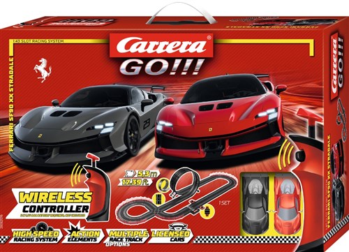 2X Carrera bilar (Ferrari SF90)2X trådlösa handkontroller med hastighetsjustering och turbobooster5,3 M bilbana med korsande spår, en övergång, slinga, chicanesStrömförsörjning och anslutningstillbehör