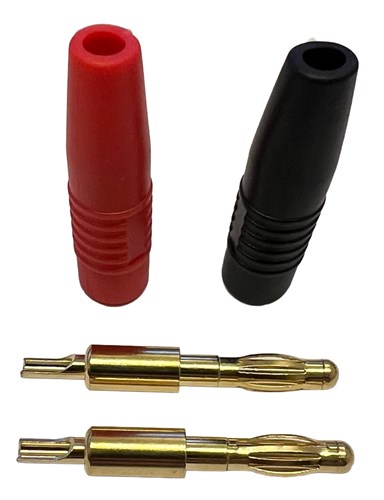 4mm bananpluger. Leveres som et par med en rød og en svart. Bannanpluggen må settes på plass og deretter så må ledninger loddes på.