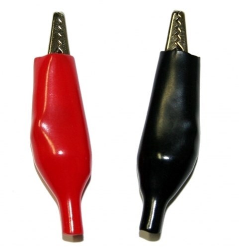 Krokodilleklemmer. Leveres som et par med en rød og en svart.