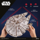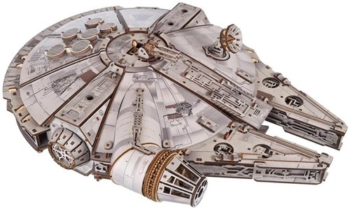 Komplett modell bestående av laserskurna träpaneler som tillsammans återskapar den ikoniska Millennium Falcon. Modellen inkluderar ett infällbart tak, detaljerad interiör, rörliga lastdörrar, ramp, kanontorn och en roterande 360°-antenn. Batteridrivna LED-lampor simulerar hyperdrive-motorerna, medan färgade element och högdensitetsfiberplatta ger både visuell autenticitet och styrka. Detta är ett avancerat byggset och skicklighet krävs, byggsatsen består av 1235 delar, inga specialverktyg eller lim krävs.