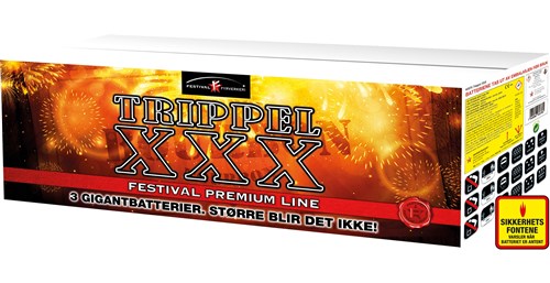 10% rabatt ved reservasjon t.o.m. 28. desember. Bruk rabattkode: GodtNyttÅr Enormt batteri med 3 kasser i 1 stor beholder. Trippel XXX byr på 146 skudd med stor variasjon i 15-45 meters høyde. Dette megabatteriet inneholder 2900g krutt og gir deg over 3 minutter med et sinnskykt show!