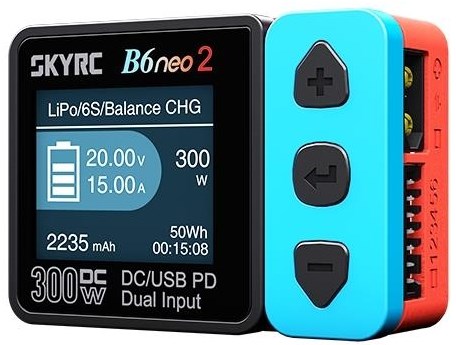 SkyRC med en laddare så kompakt att den får plats i fickan, B6 Neo 2! Denna laddare har en laddningseffekt på 300W (DC) med en maximal spänning på 15A! B6 Neo 2 har XT60 DC-ingång och Type-C PD (80W) vilket ger dig stor flexibilitet! Dessutom är laddaren en batterikontroll som kontrollerar LiPo-, LiHV-, LiFe- och LiIon-batterier. All data visas på färgskärmen och styrs enkelt via endast tre knappar!