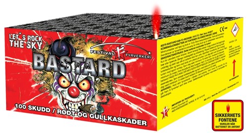 10% rabatt ved reservasjon t.o.m. 28. desember. Bruk rabattkode: GodtNyttÅr Batteri med høy intensitet og 100 skudd! Bastard har raske avfyriinger, kraftige drønn og kjappe effektskifter i rødt og gull. Batteriet har en varighet på ca. 35 sekunder.