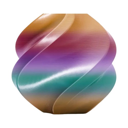 Silk Dual ColorImponerande tvåtonseffekter med Bambu Lab PLA Silk Dual Color. Varje tråd består av två noggrant utvalda färgtoner som smälts samman till ett enda filament. När det färdiga objektet roteras skiftar färgen sömlöst mellan de två nyanserna.