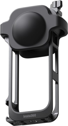 Insta360 X4 Air Utility-ram. Solid metallram ger skydd runtom och ger enkel åtkomst till batteriet. Ramen har en snabbkopplingspunkt, ett cold shoe-fäste och tio 1/4-tumsfästen. Levereras även med akustiskt skum av hög kvalitet för tydligare ljud i vind eller höghastighetsaktiviteter.