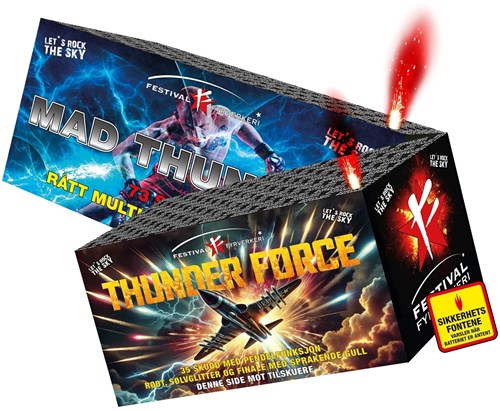 Rått multivinklet batteri med 4 forskjellige skytemønster. Fargekombinasjoner i sølv, gull, lilla og blått. mad Thunder har kule palmer og blinkeffekter. Batteriet har 73 skudd og varer i ca. 55 sekunder.