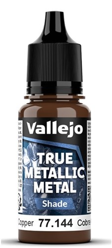 Vallejo TMM-serien (True Metallic Metal) är en specialutvecklad akrylfärg för modell- och miniatyrmålning. Skuggfärgerna är icke-metalliska, men utvecklade med pigment som ger ett metalliskt uttryck och bevarar glansen i baslagret. Används för att skapa skuggor, djup och kontrast, och är mellansteget i Base-Shade-Light-systemet. Skuggfärgerna kan spädas ut med vatten för mer subtila skuggor och övergångar. För dig som vill ha metallytor med ett autentiskt uttryck.
