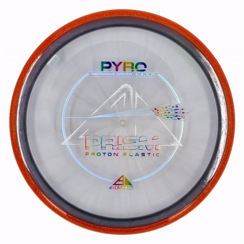 rism Pyro debuterer med et standard trippelfolie-stempel, som i kombinasjon med en Proton-kjerne og Prism-kant produserer en fantastisk tofarget gjennomskinnelig skive. Prism Proton Pyro ble designet som Axioms første overstabile mellomtone med mer glid enn MVP Deflector og en imponerende stabil finish. Pyro har nok stabilitet for jevne flyvninger i sterk vind og kraftige kast uten å miste linjen og svinge av målet. Disken leveres i tilfeldig farge.