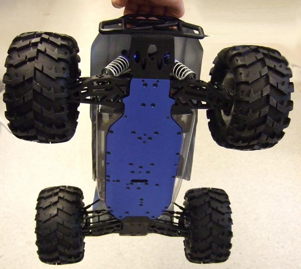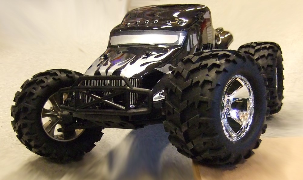 Stor børsteløs monstertruck med børsteløst oppsett, 2stk 3200mah 2S LiPo-batterier, 2.4GHz radio med mottaker ferdig innstallert i bilen. Bilen har ferdig lakkert karosseri og store hjul slik at man kan kjøre i terrenget, bilen er hele 50cm lang har chassis i kraftig 3mm aluminium. Batteriene har ferdig påloddet Deans-kontakter og XH-balanseringsplugg. Det følger ikke med lader så da passer det fint med en Computer LiPo-lader, batterier til radioen følger heller ikke med så i tillegg til lader trenger man 8AA batterier til denne.